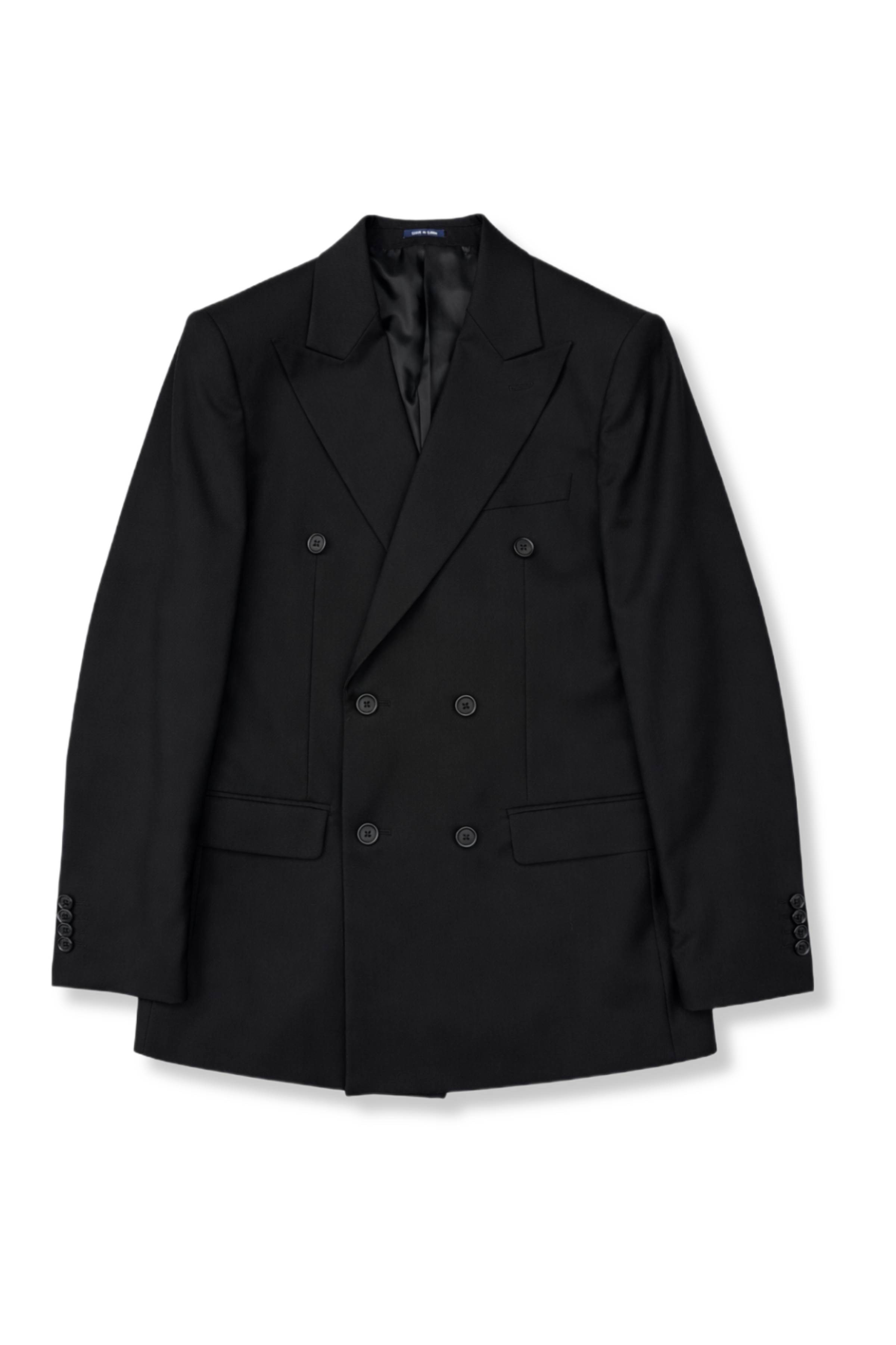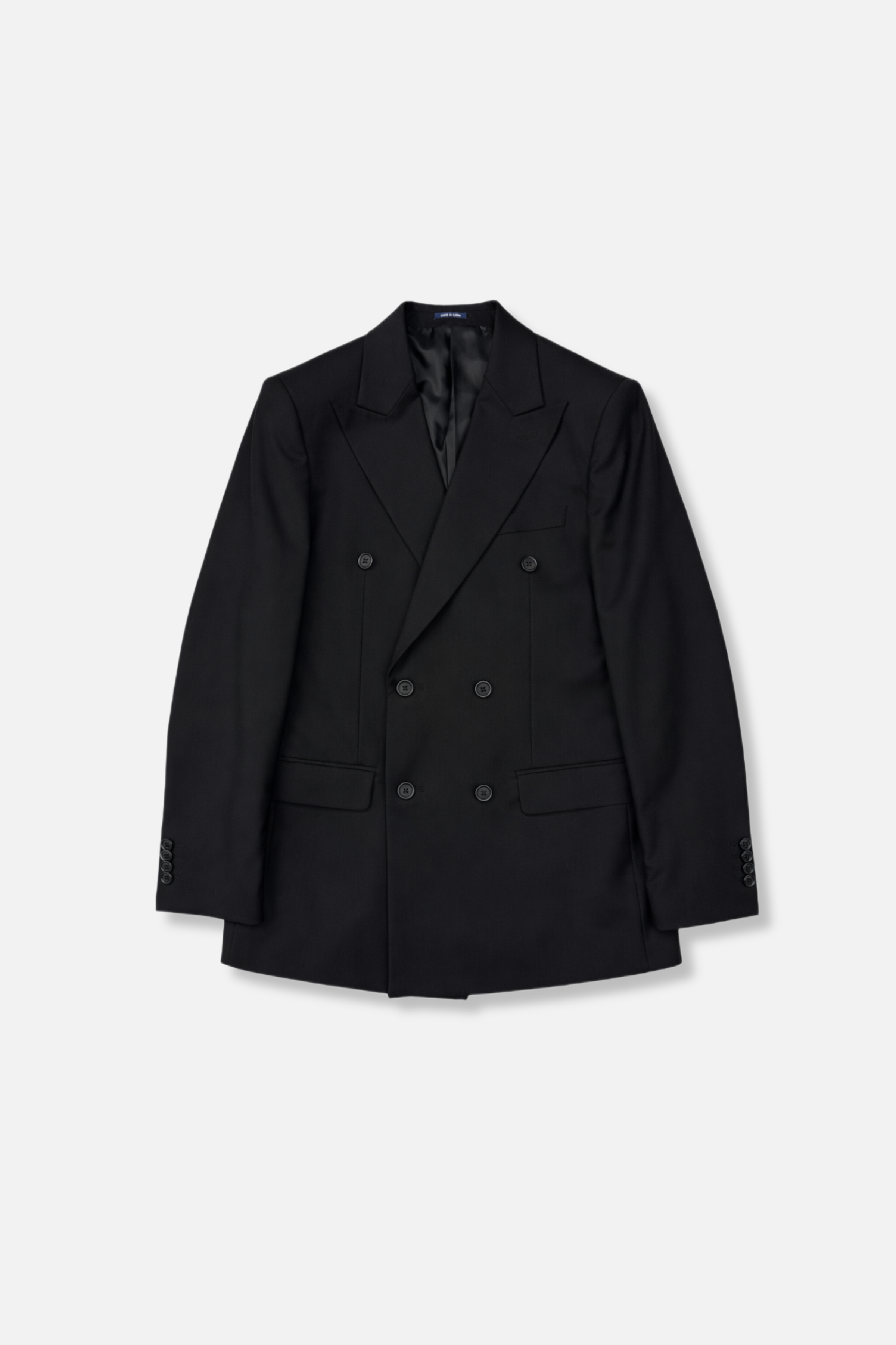 - Peak lapels, side vents, two front pockets.