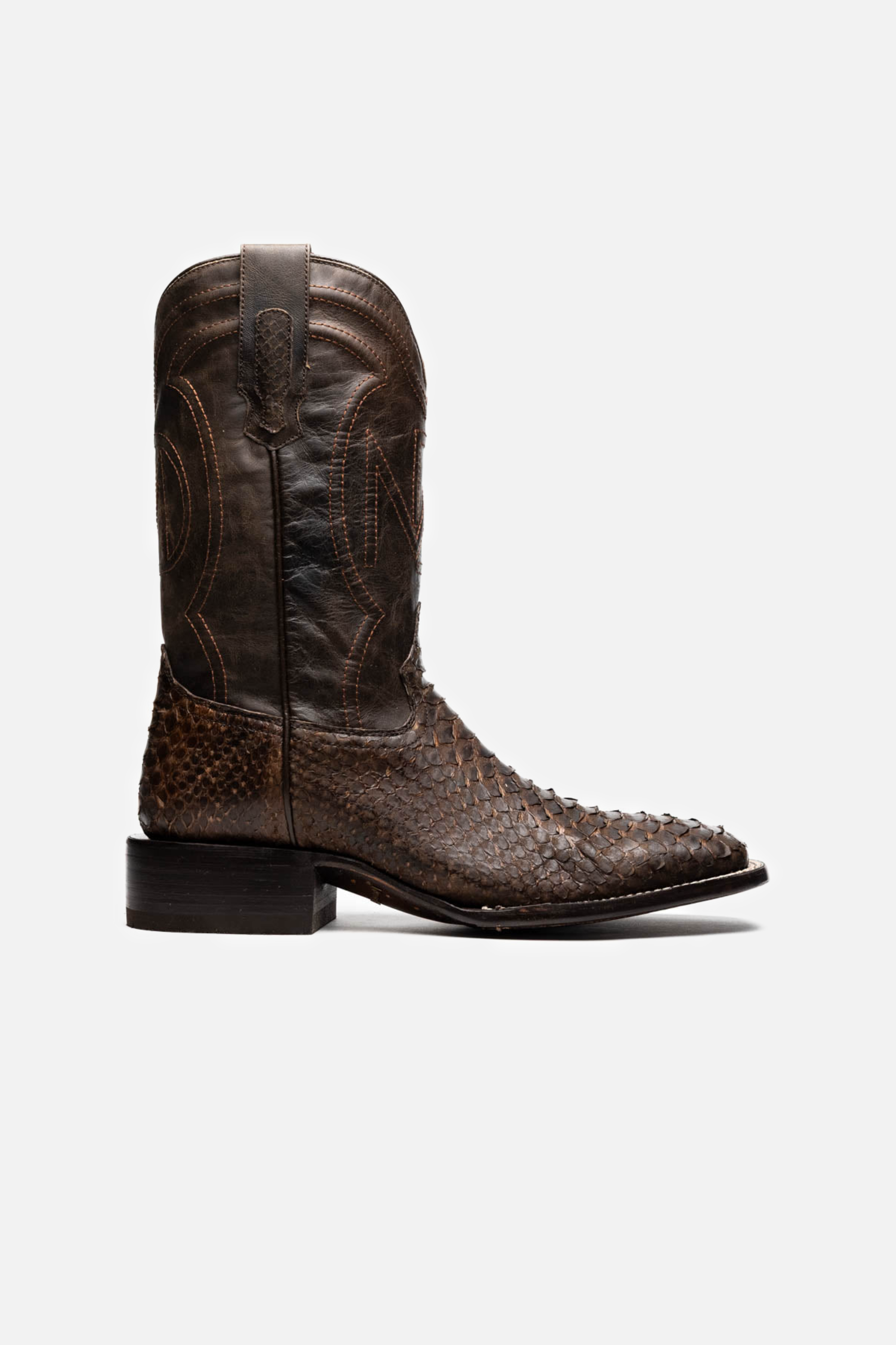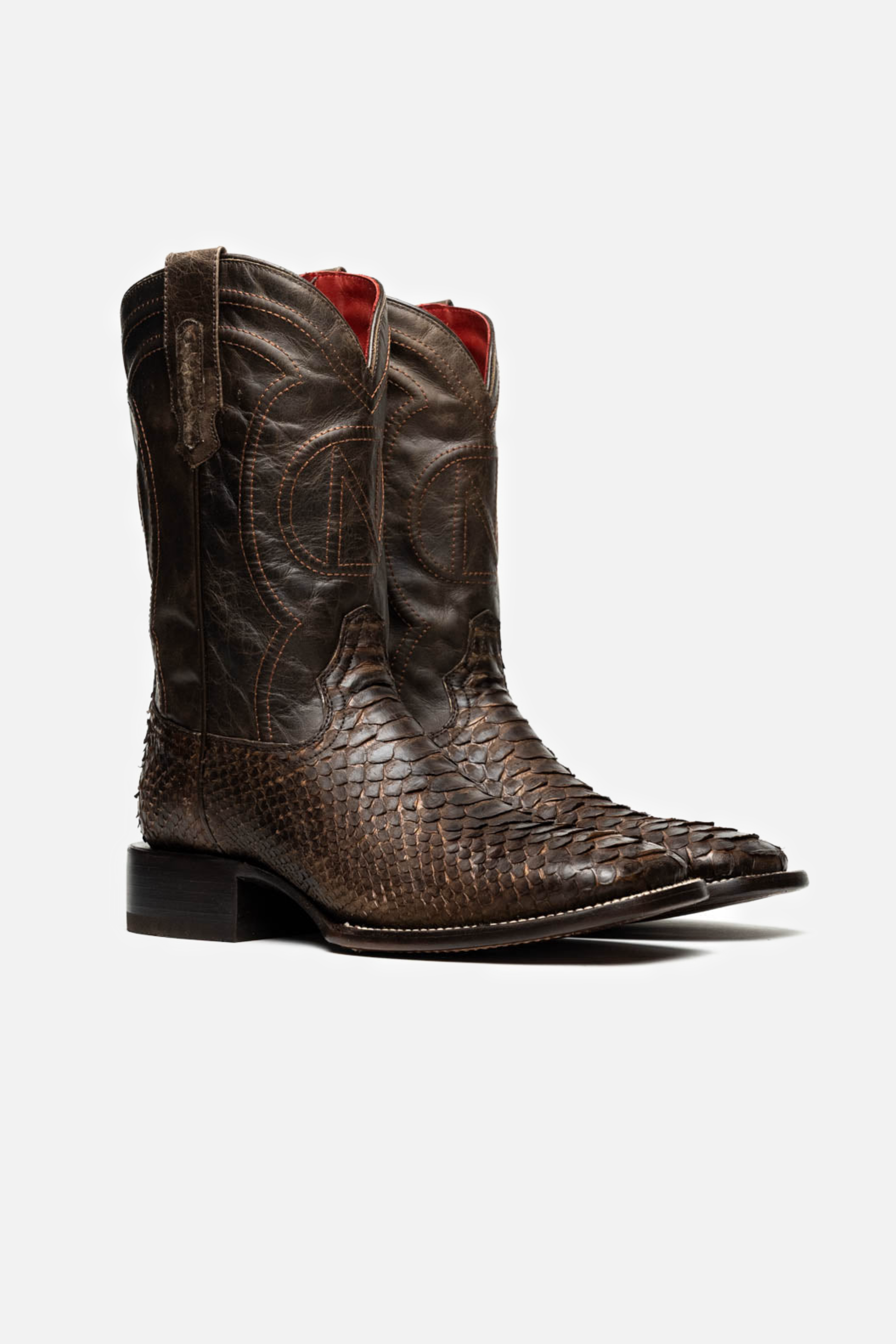 The MISSOURI boot captures the spirit of the West through bold design, master craftsmanship, and premium exotic materials. Handcrafted using genuine Python skin on the vamp and full-grain leather on the shaft, it delivers rich texture and visual contrast. The defining square toe adds a confident, modern twist to the classic cowboy profile, while the signature red leather lining brings a refined interior finish.