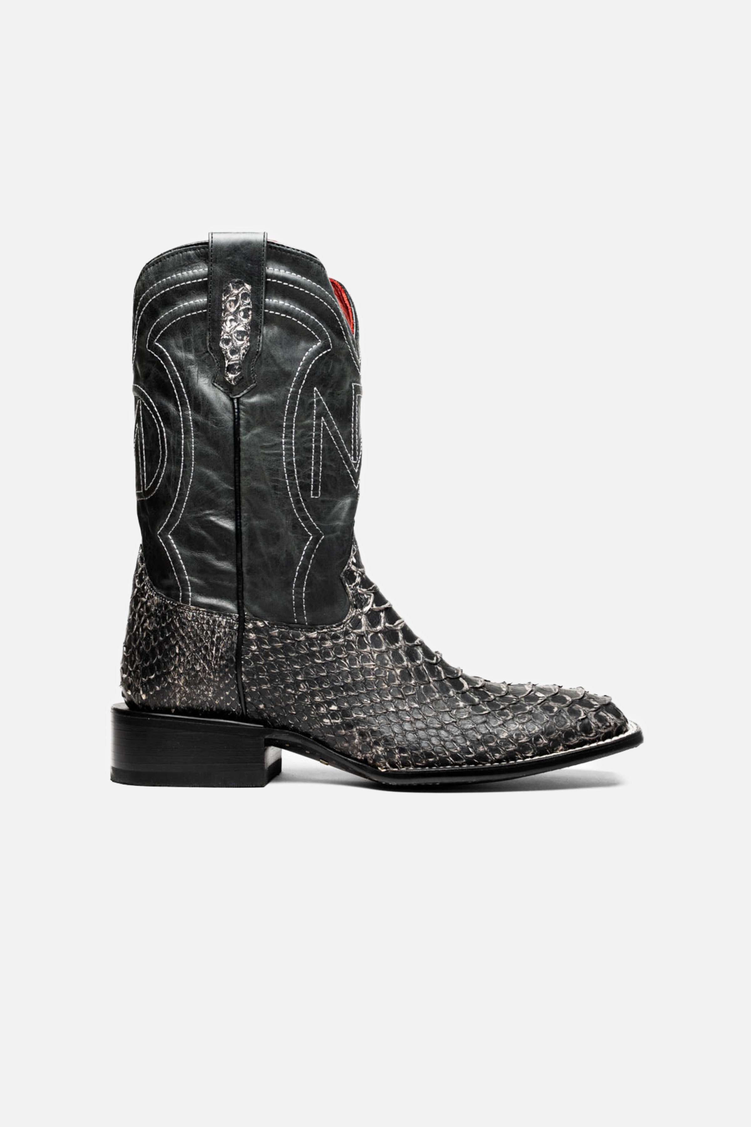 The MISSOURI boot captures the spirit of the West through bold design, master craftsmanship, and premium exotic materials. Handcrafted using genuine Python skin on the vamp and full-grain leather on the shaft, it delivers rich texture and visual contrast. The defining square toe adds a confident, modern twist to the classic cowboy profile, while the signature red leather lining brings a refined interior finish.