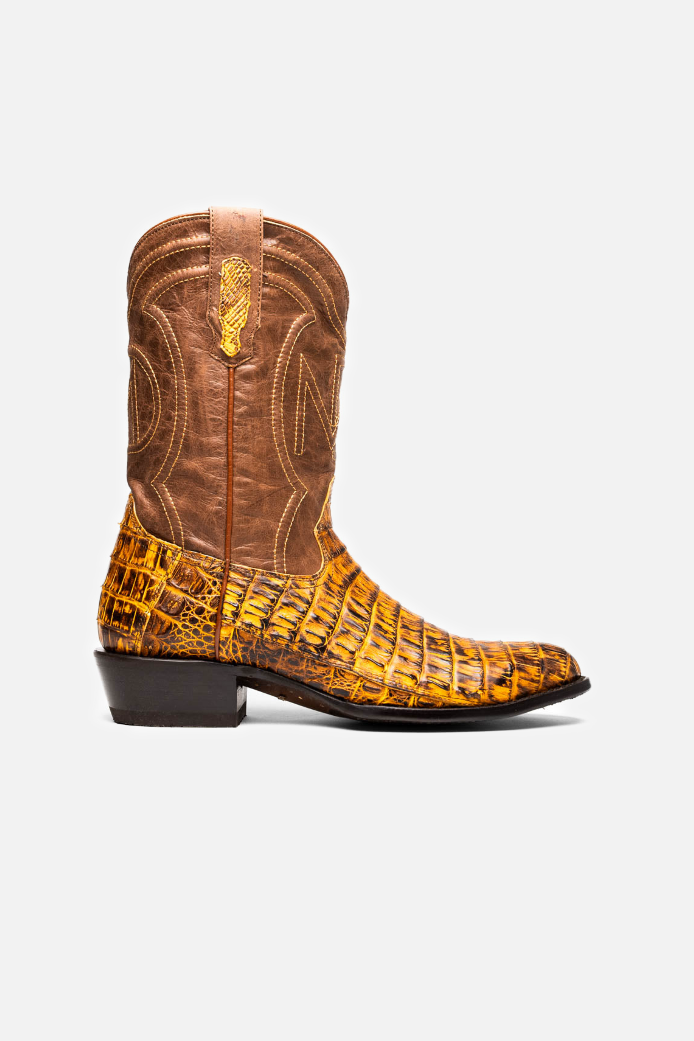 The PHOENIX boot is a refined expression of Western power and presence. Crafted with genuine caiman belly skin across the vamp and full-grain leather on the shaft, it brings a bold yet polished attitude to the cowboy silhouette. With its naturally smooth texture, subtle belly-scale pattern, and round toe finish, the PHOENIX delivers strength and sophistication in equal measure.
