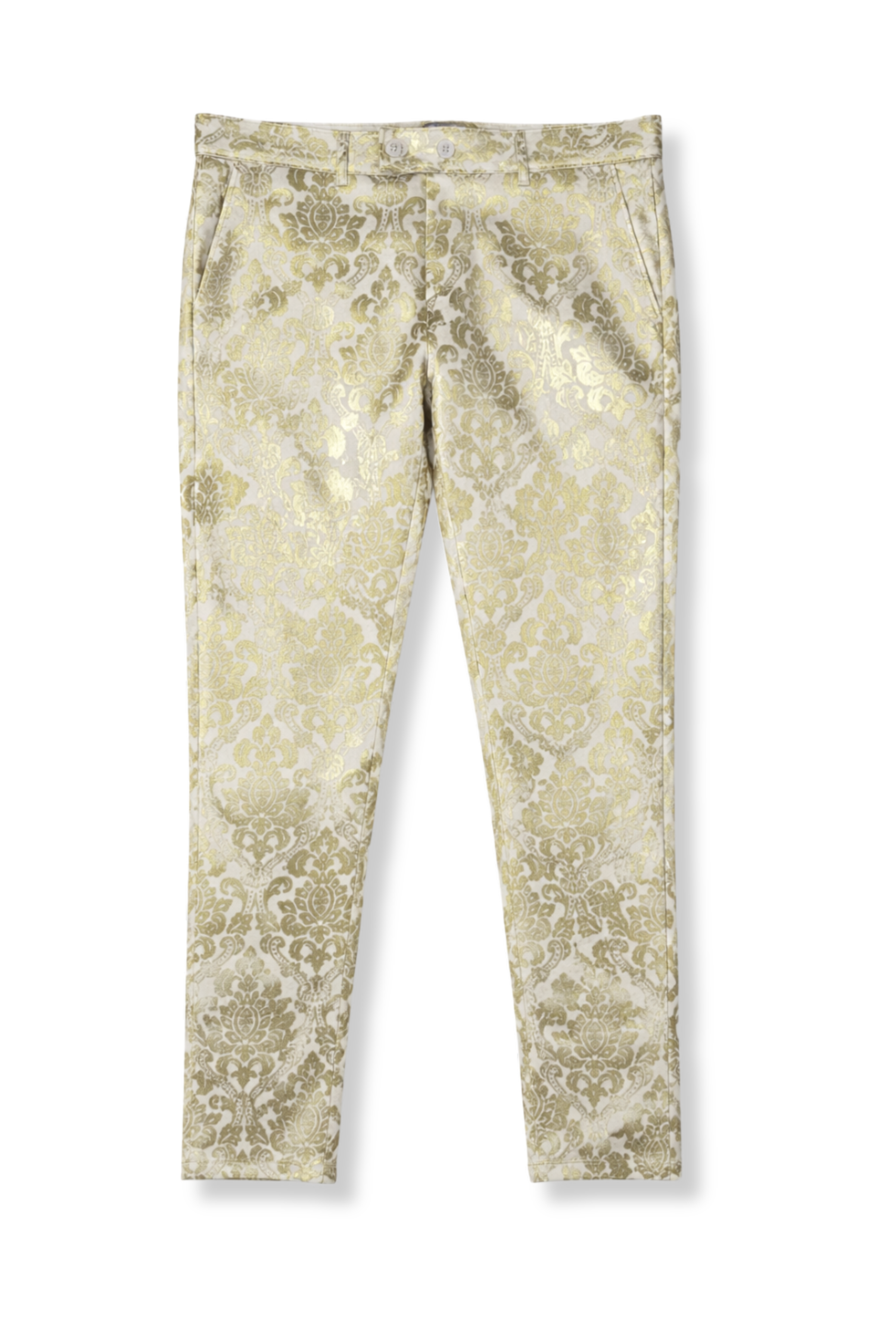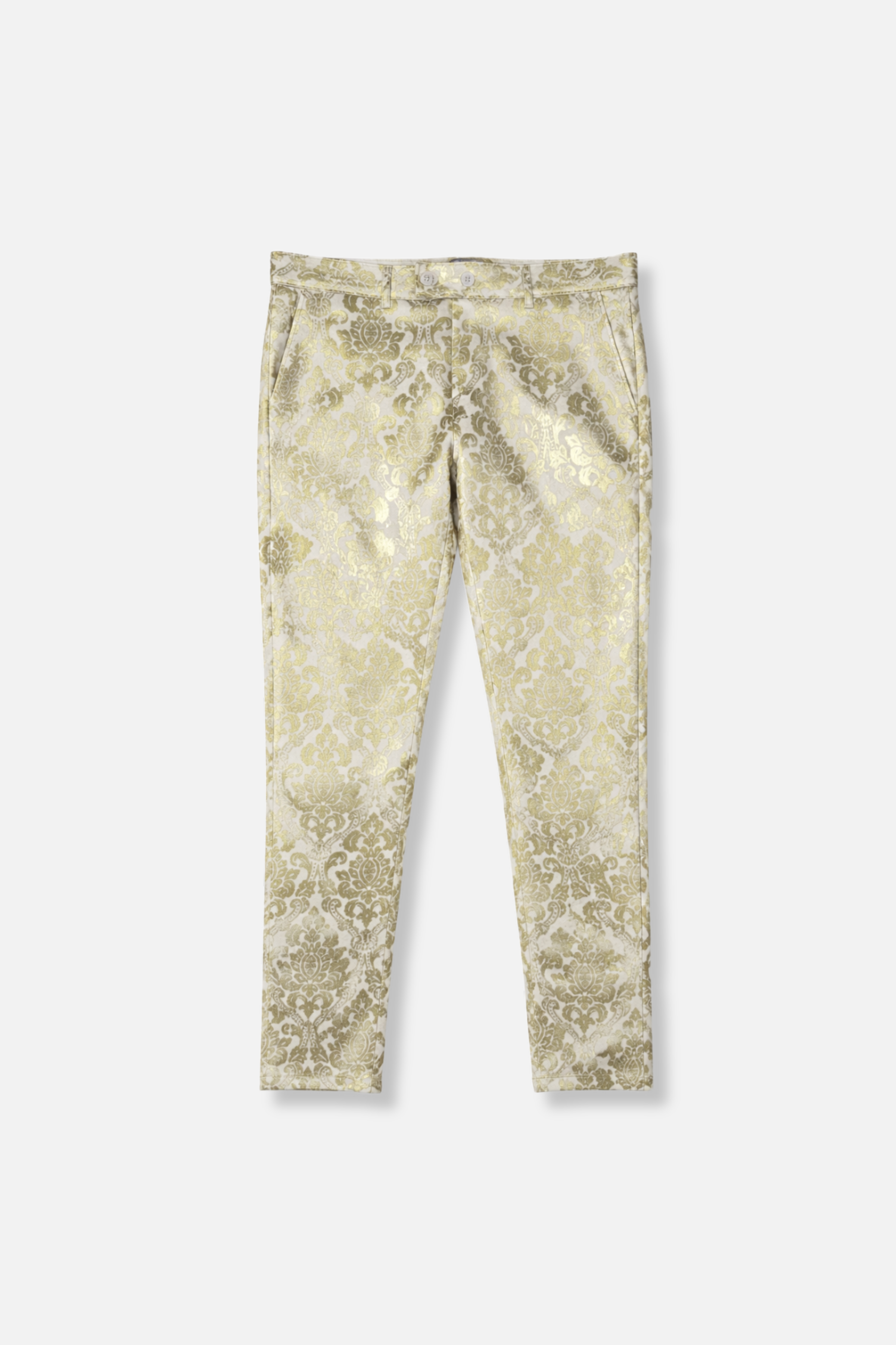 - Zipper and button closure on the waistband