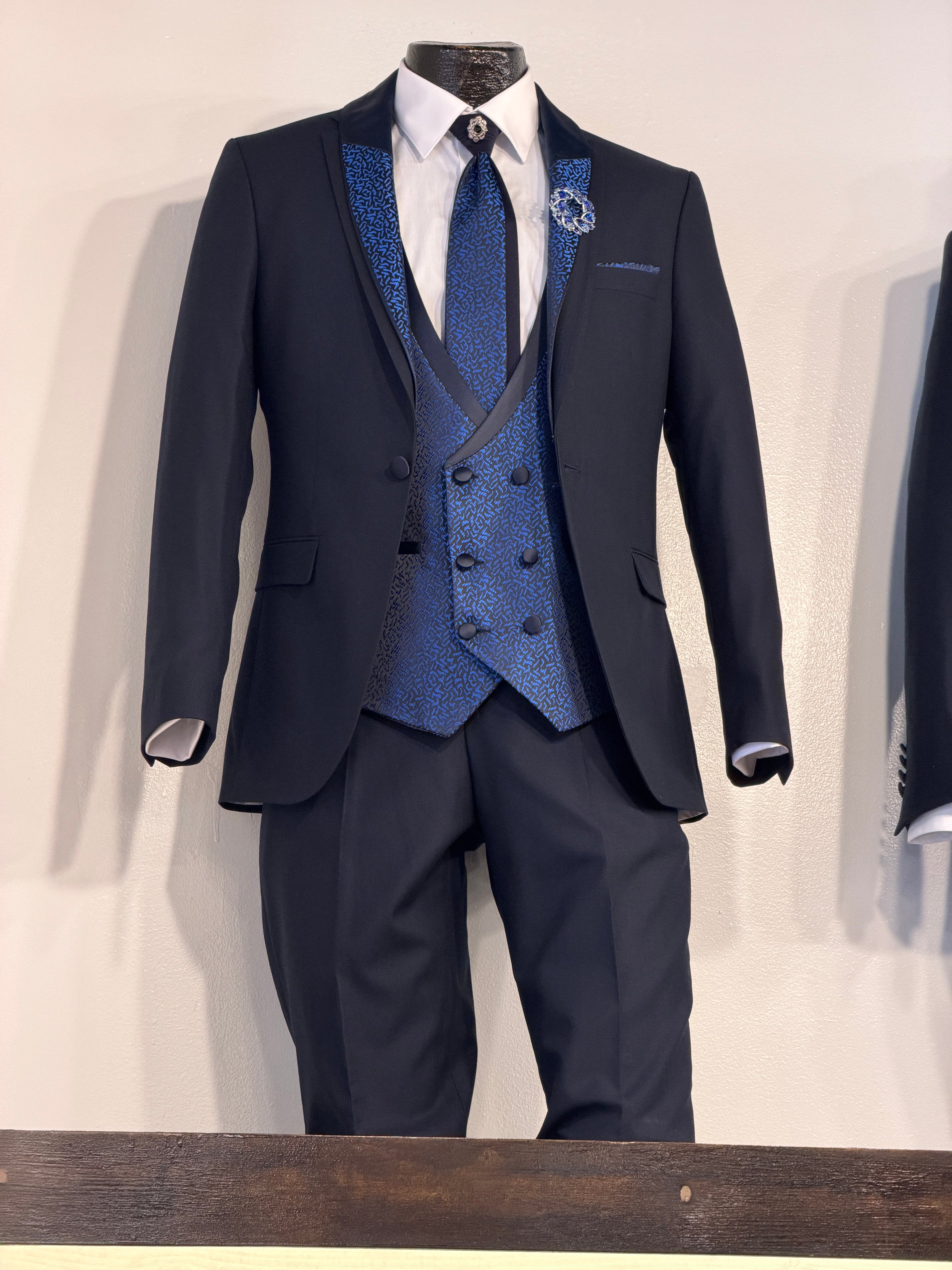 - Matching brocade vest & tie for a coordinated formal look