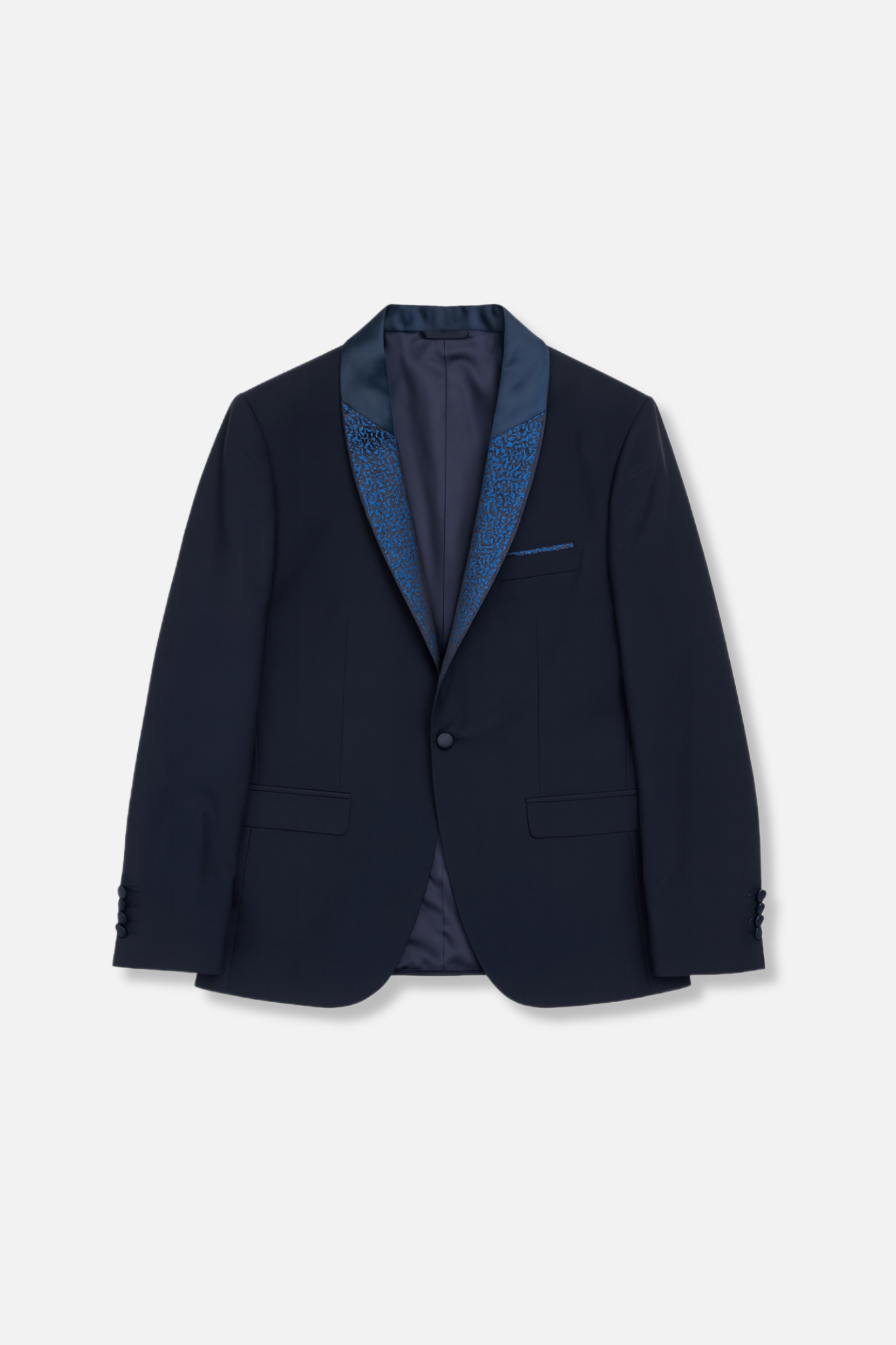 - Elegant satin shawl lapel with blue brocade contrast trim