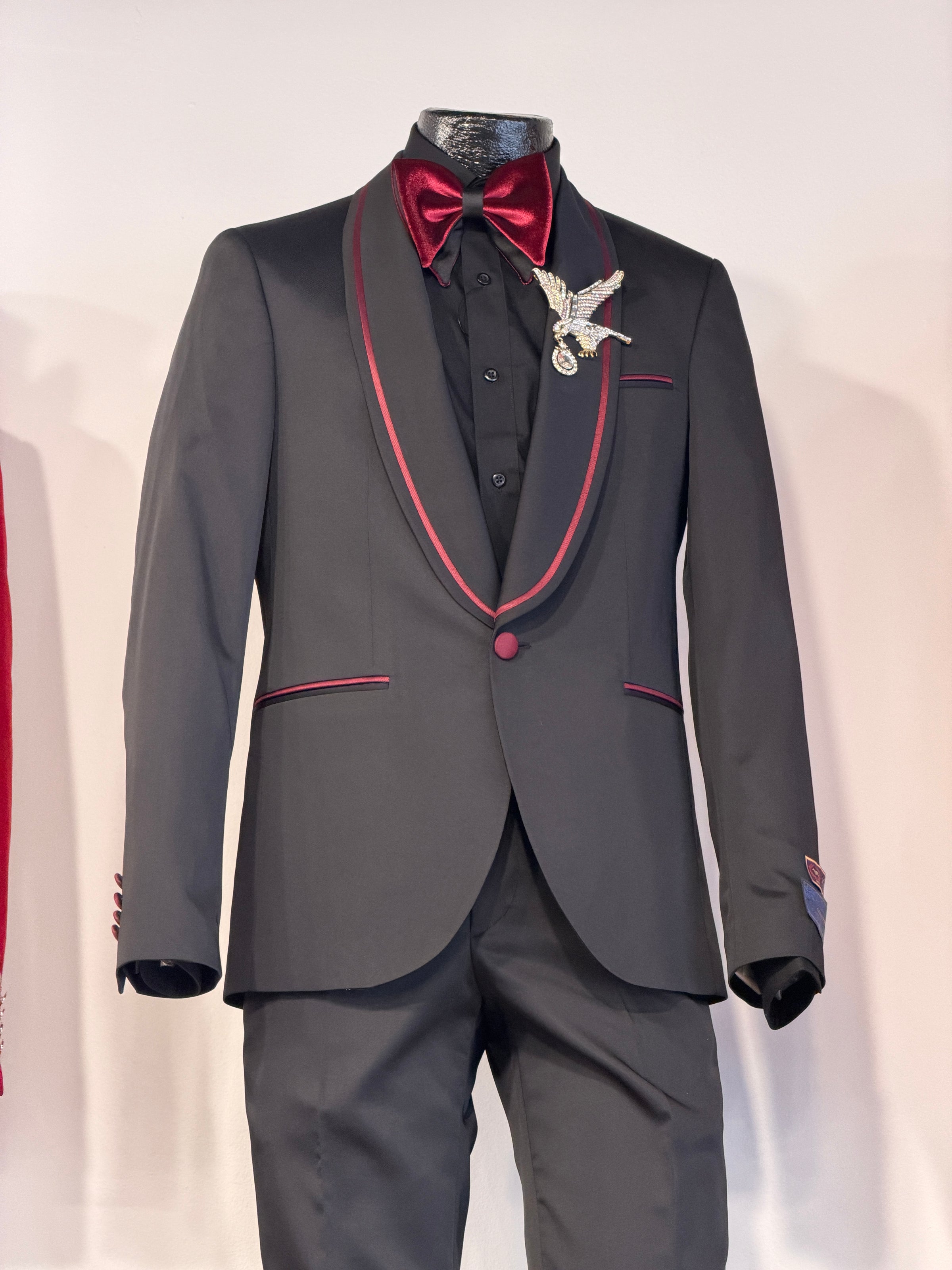 Tailored for a sharp, structured silhouette, this tuxedo set is ideal for black-tie events, weddings, galas, and upscale evening affairs. The burgundy detailing adds depth and character without overpowering the look, making it a standout choice for the confident dresser.
