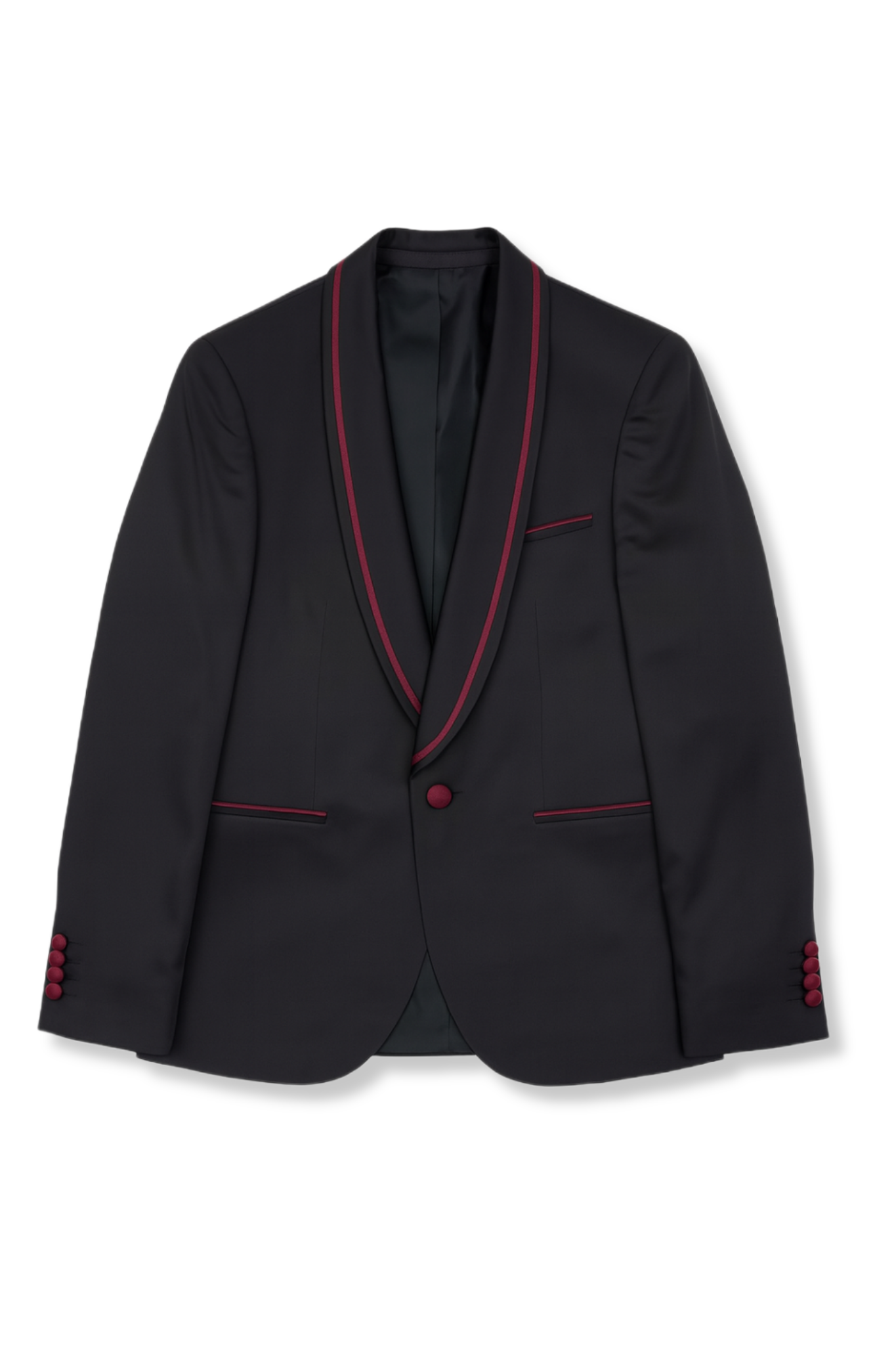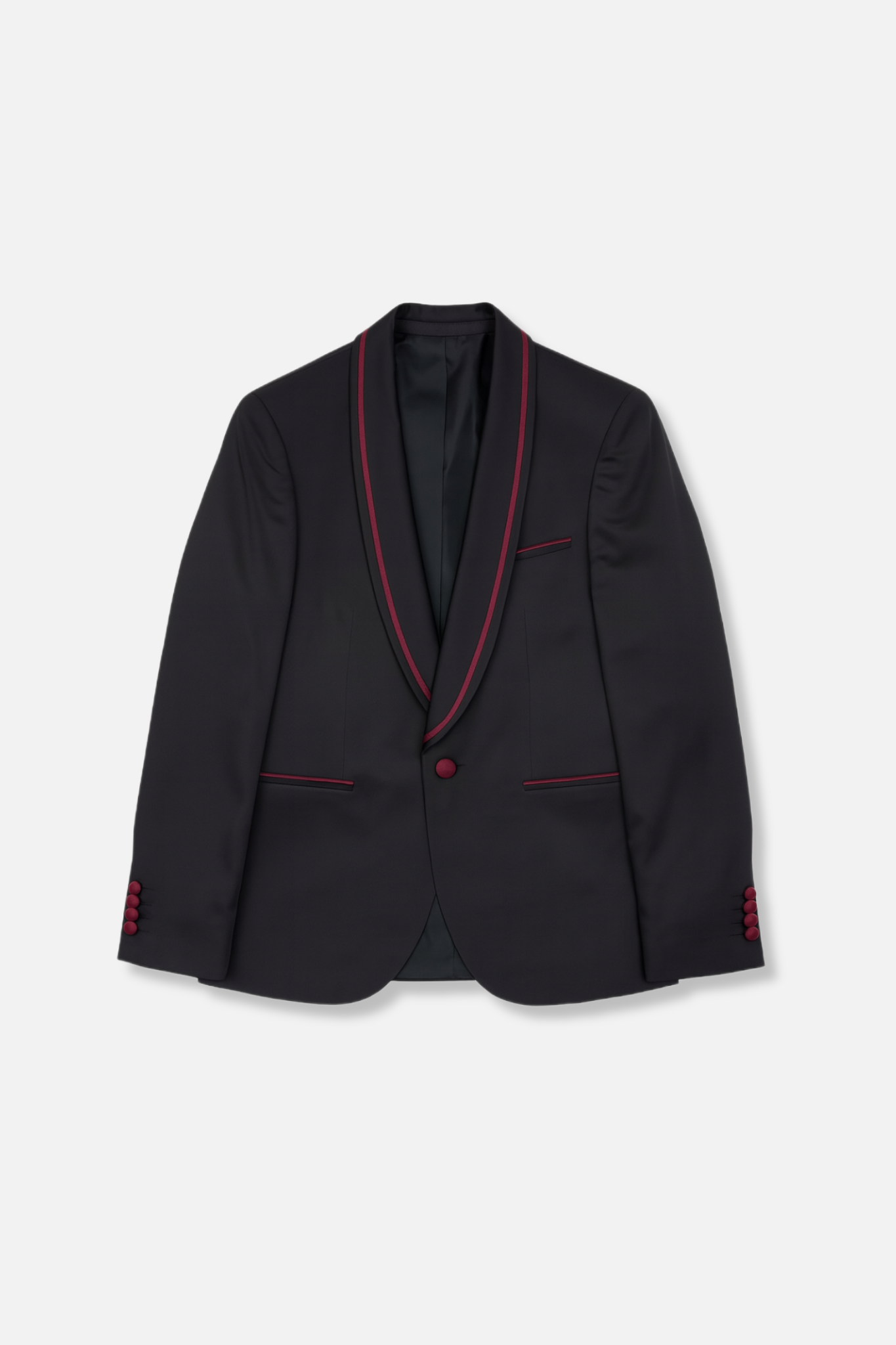 • Elegant burgundy satin shawl lapel trim